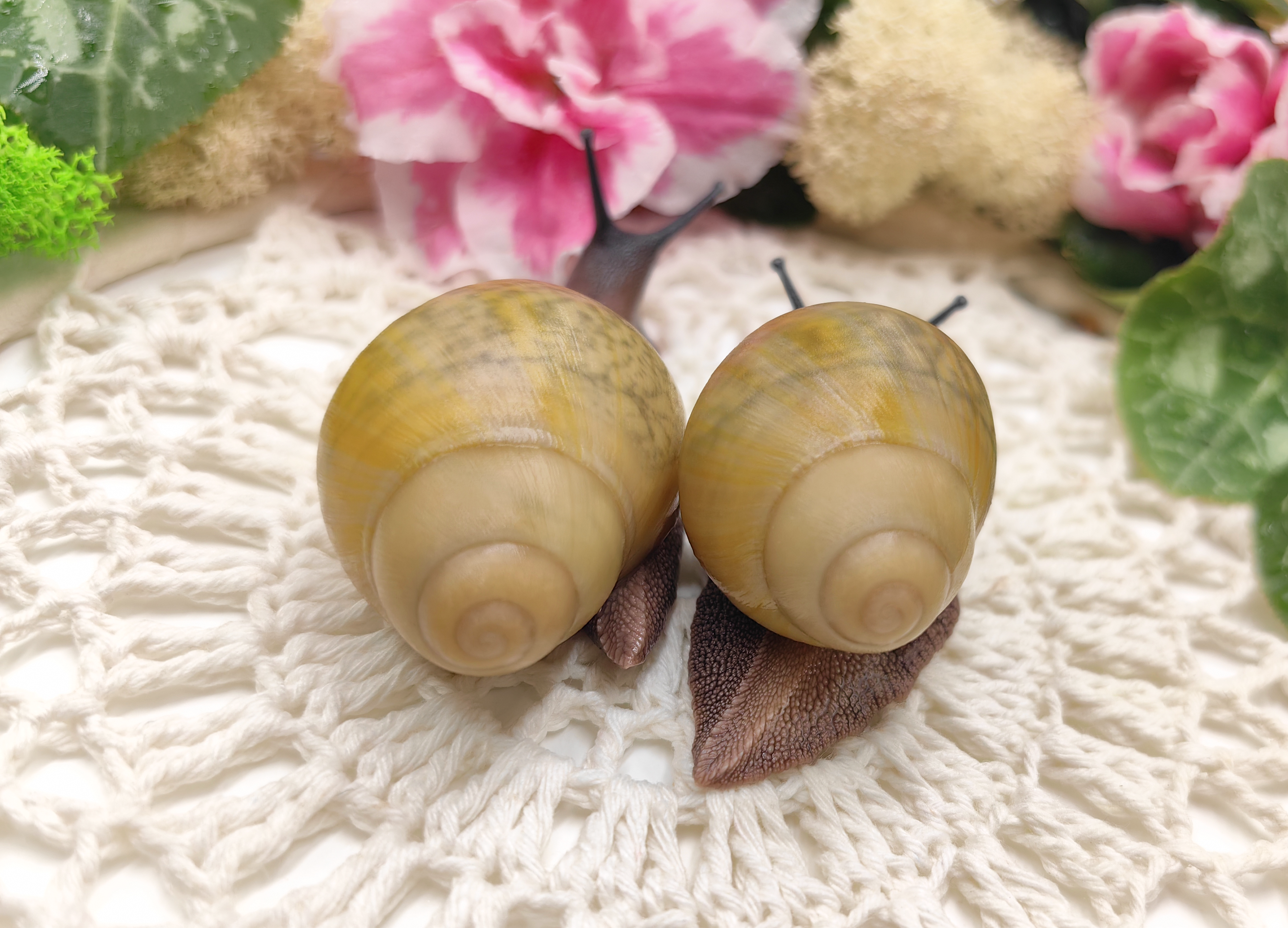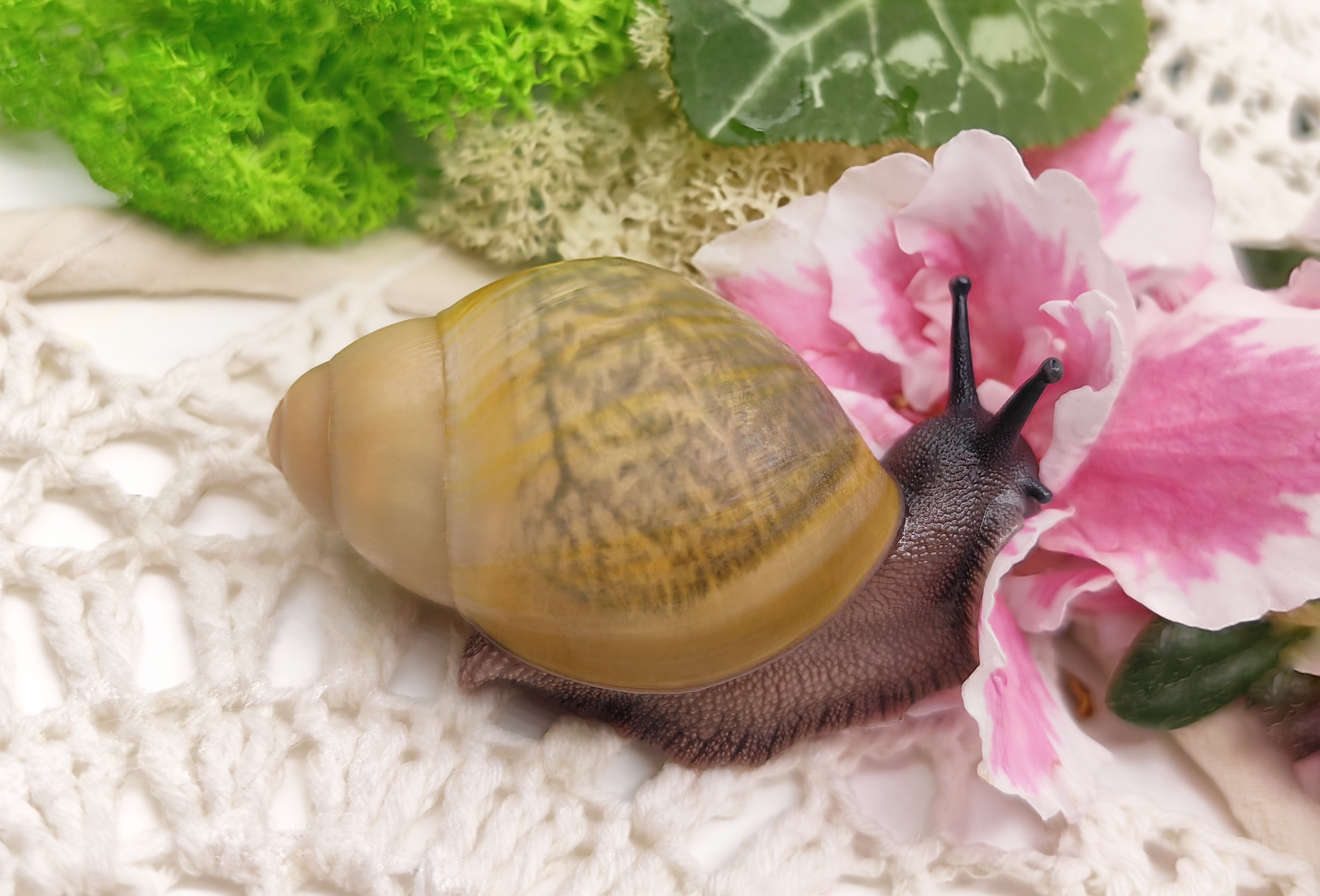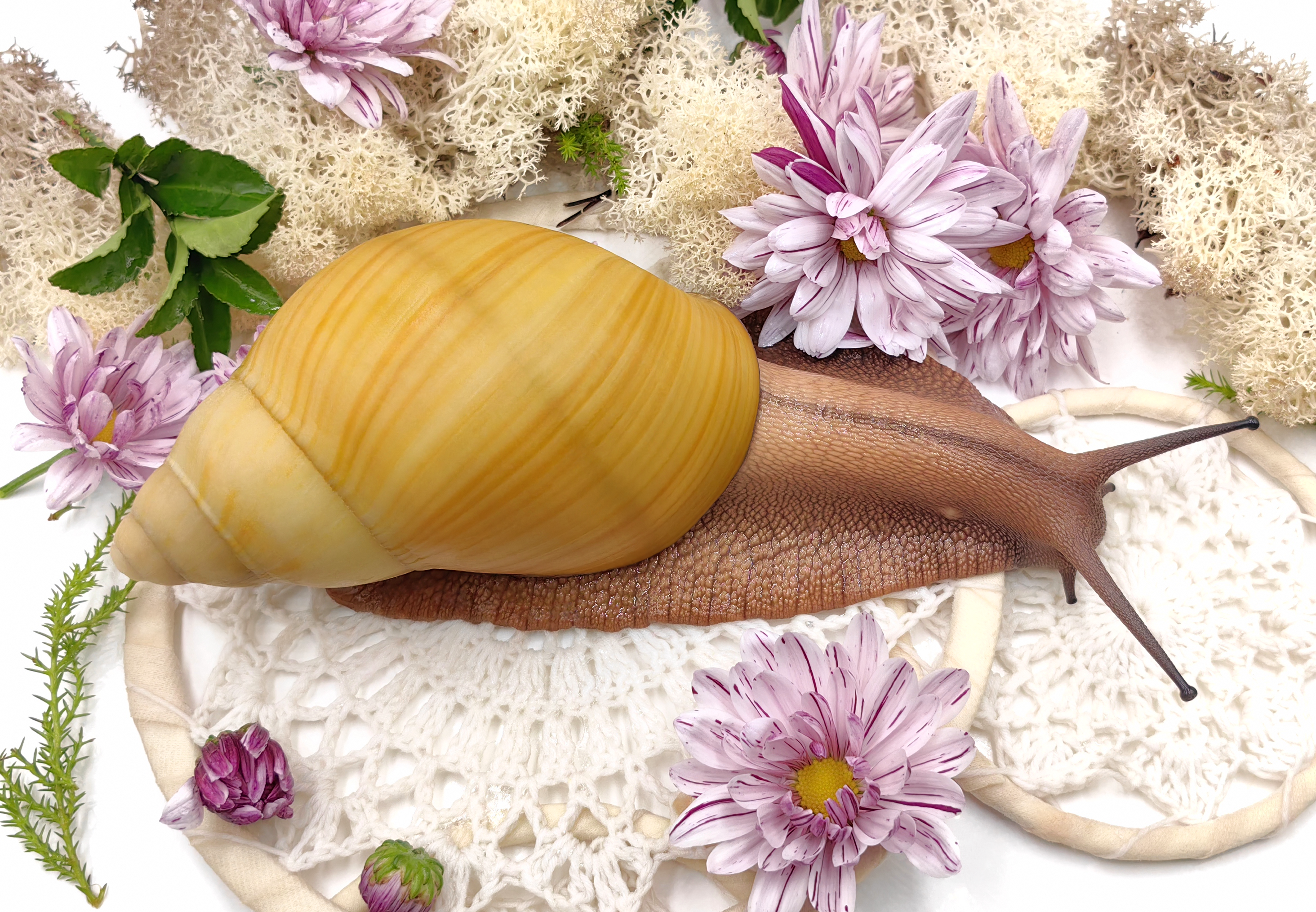 Después del primer año desde la eclosión de los huevos, los caracoles sorprenden por su tamaño y belleza, construyendo una enorme concha con un tamaño impresionante de 12-14 cm. Los ejemplares adultos, con el pie erguido y el cuerpo completamente estirado, parecen verdaderos gigantes exóticos.