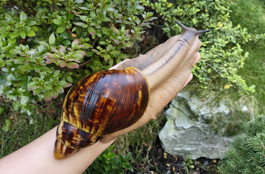 🔥 Jedne z największych lądowych ślimaków, niekwestionowane giganty Archachatina marginata ovum XXL, w odmianie barwnej standard, urzekają od pierwszego wejrzenia swoimi kolosalnymi rozmiarami. Znane wśród miłośników ślimaków brązowe olbrzymy osiągają imponujące gabaryty – ponad 16 cm muszli. To jednak nie stanowi limitu – występują także okazy o wyjątkowych rozmiarach, wahających się w granicach 18–20 cm. Muszle prawdziwych gigantów są bardzo szerokie i masywne, a jeden ślimak tego gatunku waży ponad pół kilograma.
